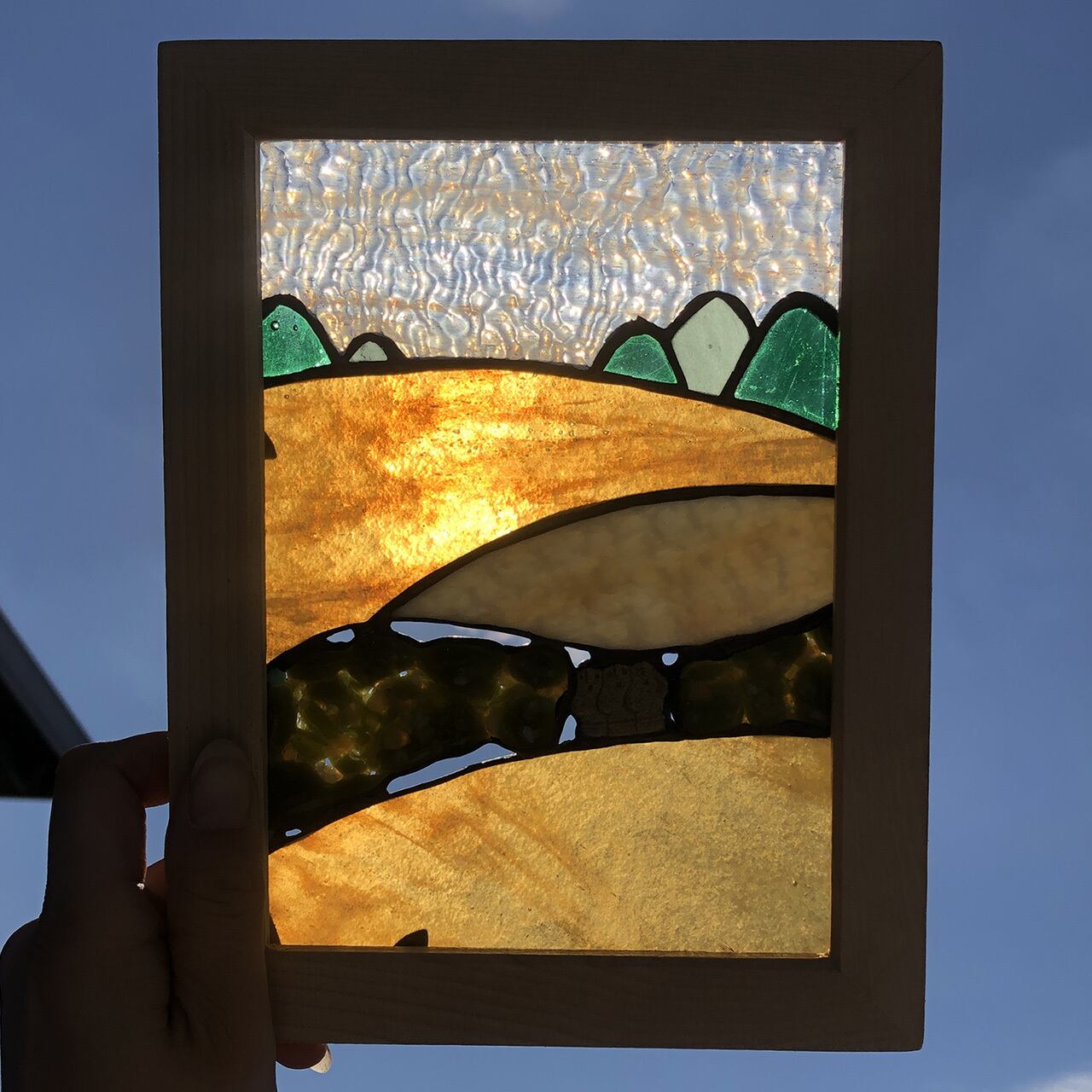 こだわりは、はにわの左右のガラスをフュージング技法で仕上げたことにより光を通すことで色が変化するステンドグラス
